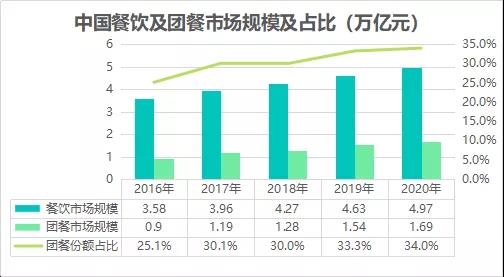 调查显示,中国居民外出餐饮占饮食全部支出比例为49.59%,高于美国的38.73%,中国消费者表现出更强的外出餐饮消费习惯偏好。团餐是我国餐饮结构中的近年来发展较快的类型之一,学生、企事业单位员工是目前主要就餐群体;未来我国养老配餐和外送及外烩等新兴团餐业务也会逐步增多。中国餐饮协会的数据显示,团餐市场规模已经达到近1.69万亿元,在大类餐饮行业中的占比也在不断提高。