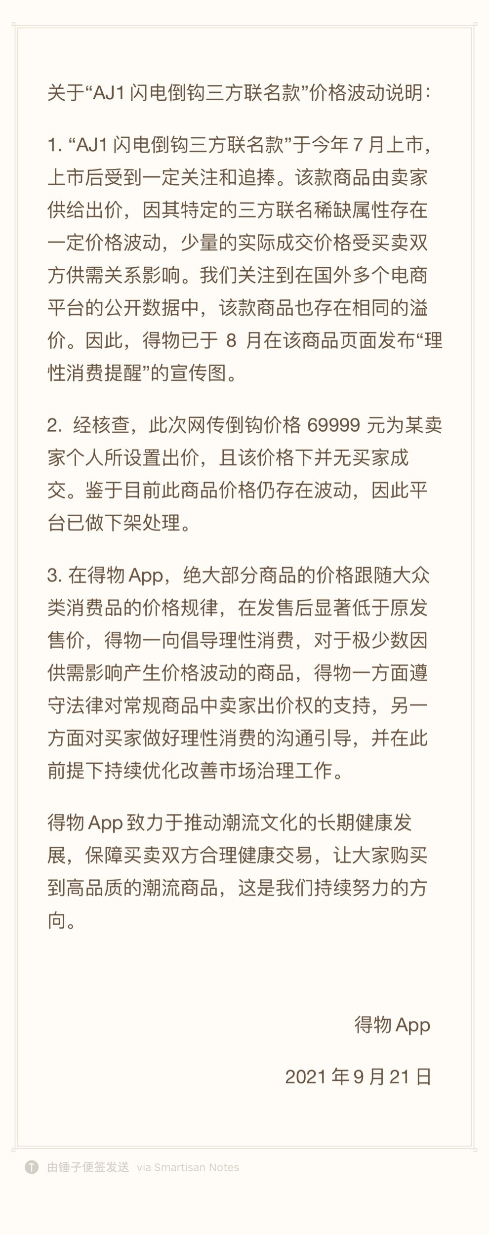 9月21日晚间,得物APP在微博发布《关于“AJ1闪电倒钩三方联名款”价格波动说明》。说明提到,经核查,此次网传倒钩价格69999元为某卖家个人所设置出价,且该价格下并无买家成交。鉴于目前此商品价格仍存在波动,因此平台已做下架处理。