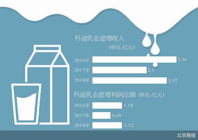 具体来看,2016-2018年,科迪乳业分别虚增收入3.36亿元、2.1亿元、2.97亿元;虚增利润总额分别为1.18亿元、6864.13万元、1.13亿元。由此看来,三年时间,科迪乳业累计虚增收入超过8亿元,累计虚增利润近3亿元。