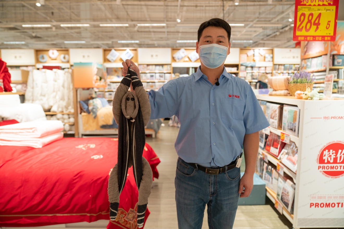 随着设计越来越多,超市也变成了潘雪东的“被子动物园”,潘学东在指导阿姨如何叠出小兔子。