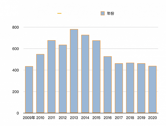 根据上述榜单历年来披露的数据,从2009年至2018年的10年间,娃哈哈的营收经历过巅峰,从2009年的436亿元到2013年达到顶峰782.8亿元;其后开始进入下坡道,到2017年下滑到500亿元以下,最近3年(2018年-2020年)始终徘徊在400多亿元的区间。