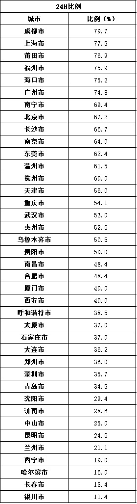 24H比例=该城市24H总量/该城市门店总量