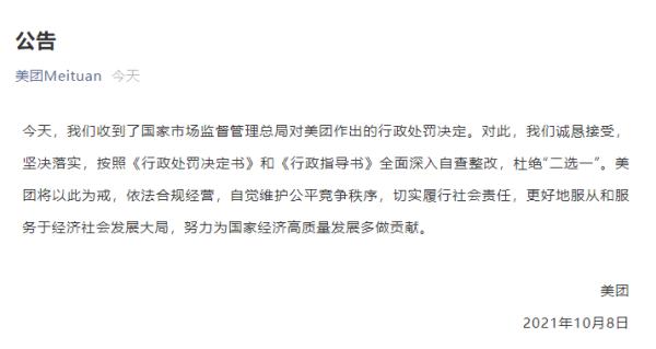 美团对此回应表示,“今天,我们收到了国家市场监督管理总局对美团作出的行政处罚决定。对此,我们诚恳接受,坚决落实,按照《行政处罚决定书》和《行政指导书》全面深入自查整改,杜绝‘二选一’。美团将以此为戒,依法合规经营,自觉维护公平竞争秩序,切实履行社会责任,更好地服从和服务于经济社会发展大局,努力为国家经济高质量发展多做贡献。”