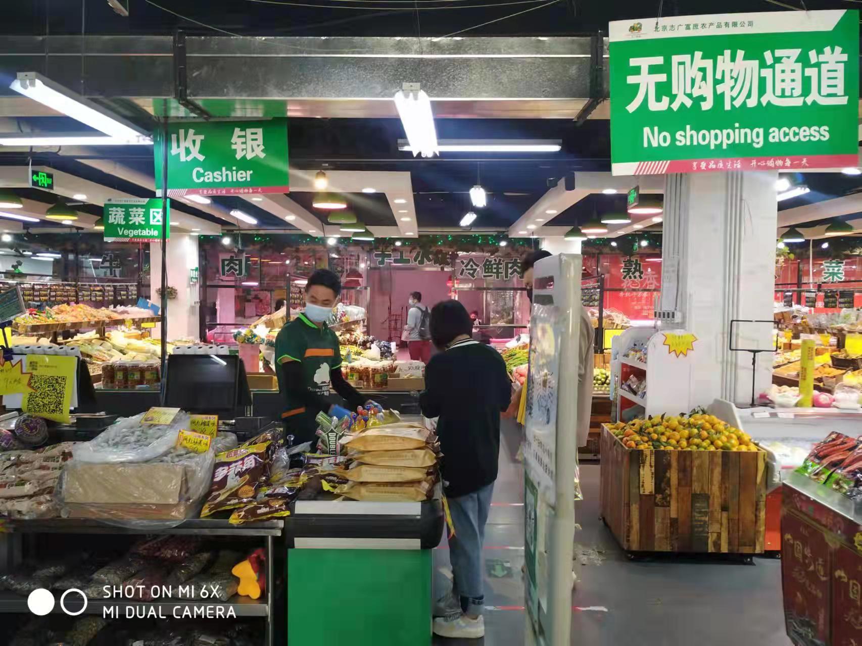 有些顾客忘带手机或手机故障不能扫健康宝,只要告诉超市前台自己所需,前台喊一嗓子,1分钟后顾客需要的大饼、肉、烟这些就会迅速被志广人拿到门口前台,告知价格,顾客只需要在前台用手机扫二维码支付即可。