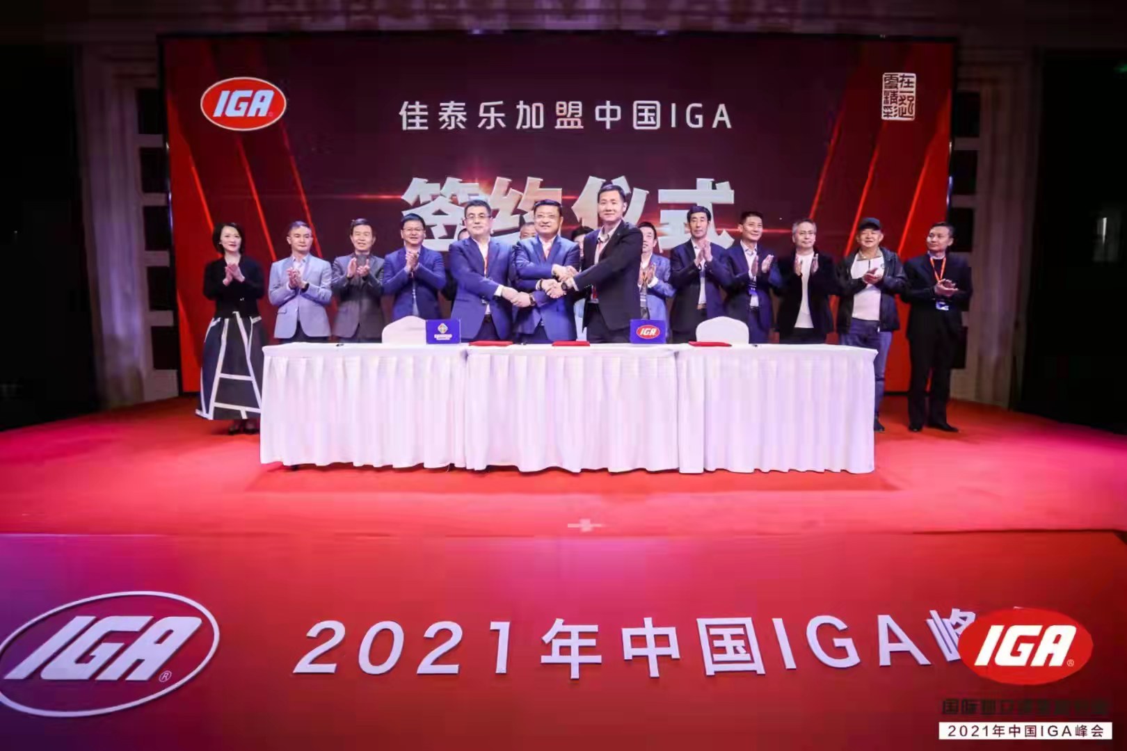 在经过前面2天的走访与会议后,20日上午,举行了签约仪式,辽宁鞍山佳泰乐超市董事长郭喜德和中国IGA董事长张健、IGA全球代表曾喆现场正式签约加入中国IGA,IGA成员企业老总共同见证了这一时刻。