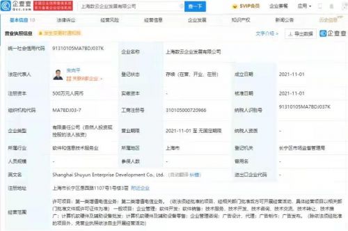 企查查APP显示,11月1日,上海数云企业发展有限公司成立,法定代表人为宋向平,注册资本 500万元人民币,经营范围包含:第一类增值电信业务;第二类增值电信业务;企业管理;软件开发;软件销售等。