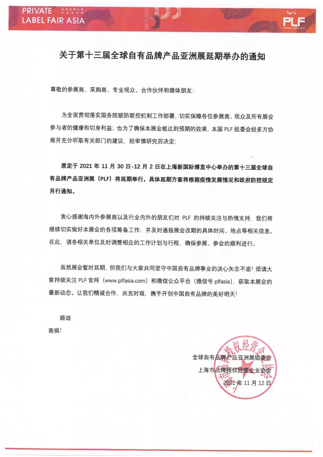 龙商网消息:11月12日,全球自有品牌产品亚洲展组委会、上海市品牌授权经营企业协会发布关于关于第十三届全球自有品牌产品亚洲展延期举办的通知。通知称,原定于2021年11月30日-12月2日在上海新国际博览中心举办的第十三届全球自有品牌产品亚洲展(PLF)将延期举行,具体延期方案将根据疫情发展情况和政府防控规定另行通知。