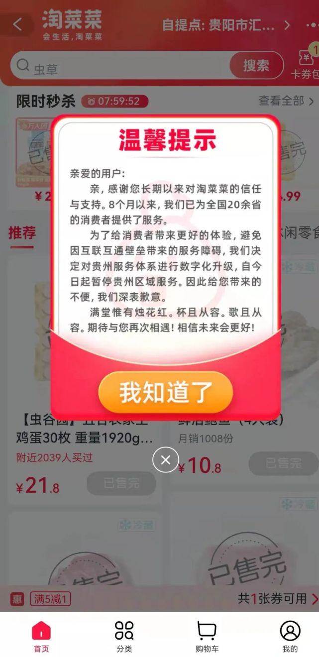 龙商网消息:11月16日,淘菜菜方面向贵州区域商家发布公告,称“避免因互联互通壁垒带来的服务障碍,决定对贵州服务体系进行数字化升级,今日起暂停贵州区域服务”。
