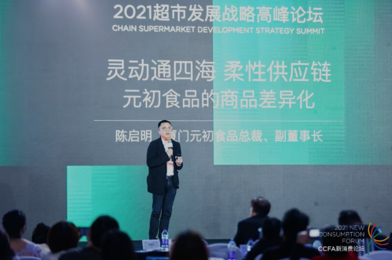 龙商网消息: 11月18日,在中国连锁经营协会CCFA新消费论坛系列峰会2021超市发展战略高峰论坛上,厦门元初食品总裁、副董事长陈启明上台分享了企业从诞生到成长中自有品牌商品开发的心得。 Dynamic Makes Solutions 灵动通四海!是元初食品柔性自有品牌的宣...