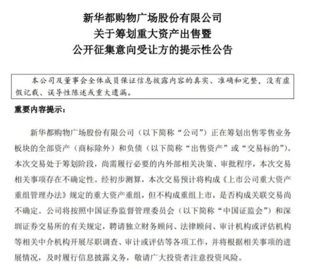 龙商网消息: 11月24日,新华都购物广场股份有限公司发布公告称,拟出售零售业务板块的全部资产(商标除外)和负债,包括除互联网营销业务以外的、其他任何与超市百货等零售业务相关的资产及负债。 目前交易对方、交易方式和交易价格尚不确定。经初步测算,...