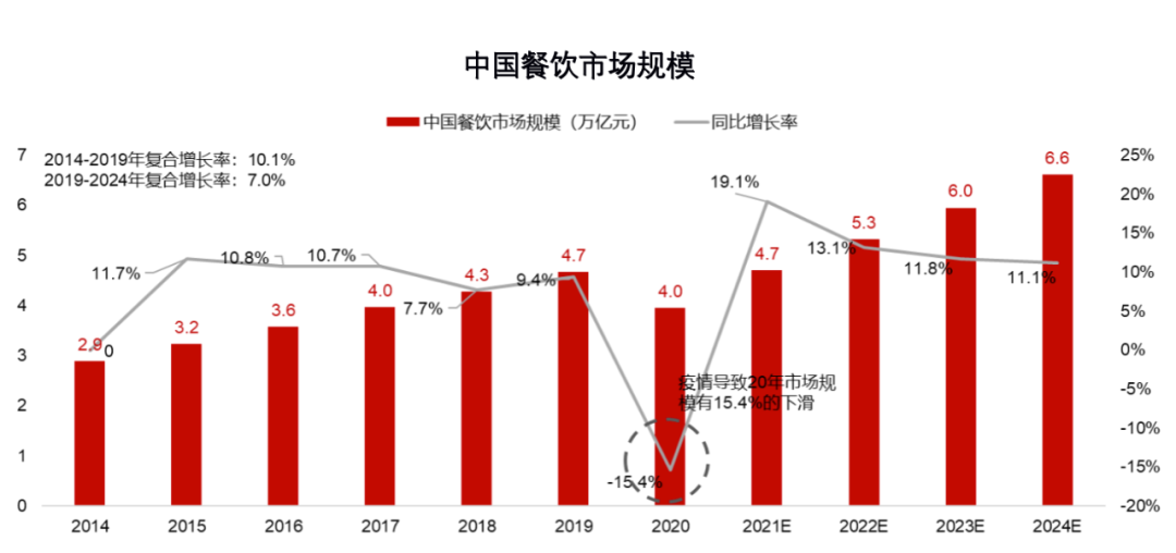 龙商网消息:11月25日,中国连锁经营协会与华兴资本联合发布了《2021年中国连锁餐饮行业报告》(以下简称报告)。《报告》显示,中国餐饮市场规模从2014年的2.9万亿元增长至2019年的4.7万亿元,年复合增长率达10.1%。由于疫情的影响,餐饮市场规模2020年下滑15.4%至4.0万亿元,但是预计2021年市场规模将恢复至4.7万亿元,之后行业将重新健康成长,2024年市场规模可达到6.6万亿元。
