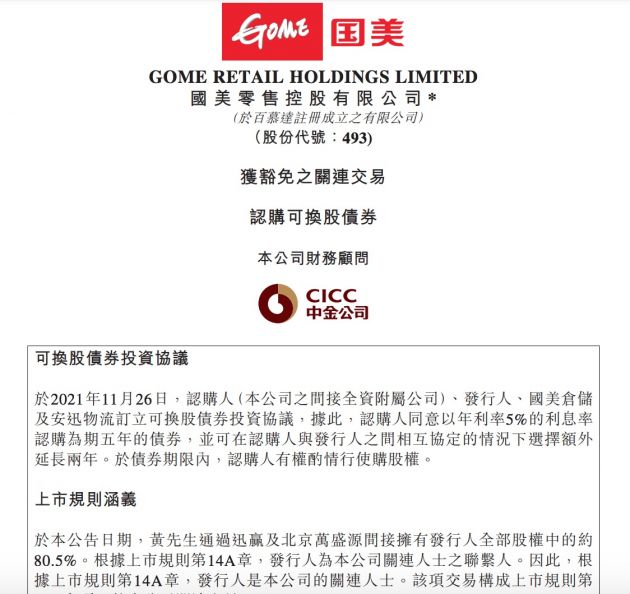 龙商网消息: 日前,国美零售发布公告称,于2021年11月26日,旗下全资附属公司与持有安迅物流有限公司(安迅物流)100%股权的北京鹏润时代物业管理有限公司订立了一份可换股债券投资协议,即国美零售以5%的年利率、投资9亿元认购安迅物流可转债,期限五年,...
