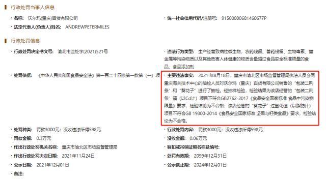 龙商网消息: 12月7日,据天眼查App显示,沃尔玛重庆百货新增行政处罚信息,因其生产经营污染物质等含量超标的食品被罚款3000元,并没收违法所得598元,处罚单位为重庆市渝北区市场监督管理局。据悉,重庆沃尔玛百货有4条行政处罚记录,罚款总金额5502元。...