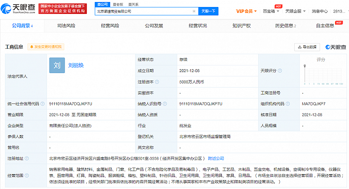 据天眼查APP显示,12月8日,北京灏璟商贸有限公司成立,法定代表人为刘丽焕,注册资本5000万人民币,经营范围包括销售家用电器、建筑材料、金属制品等。股东信息显示,该公司由北京国美电器有限公司全资持股。