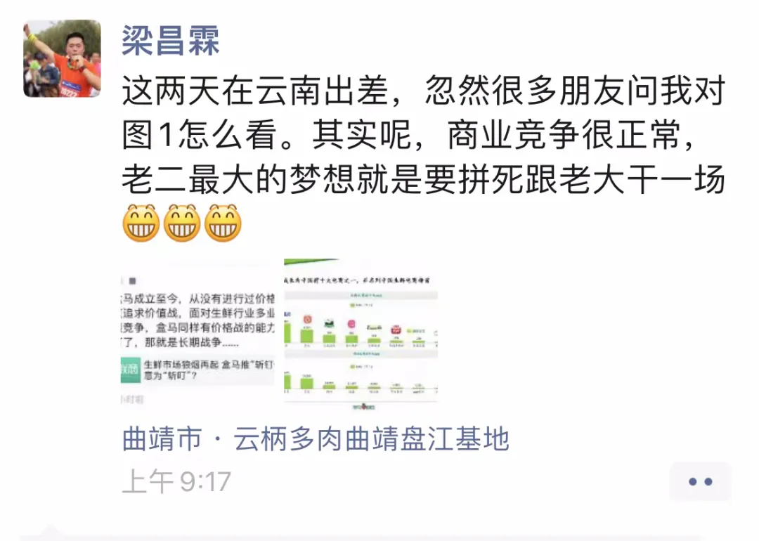 次日,一直低调的梁昌霖,在朋友圈鲜见回应,“其实呢,商业竞争很正常,老二最大的梦想就是要拼死跟老大干一场”。