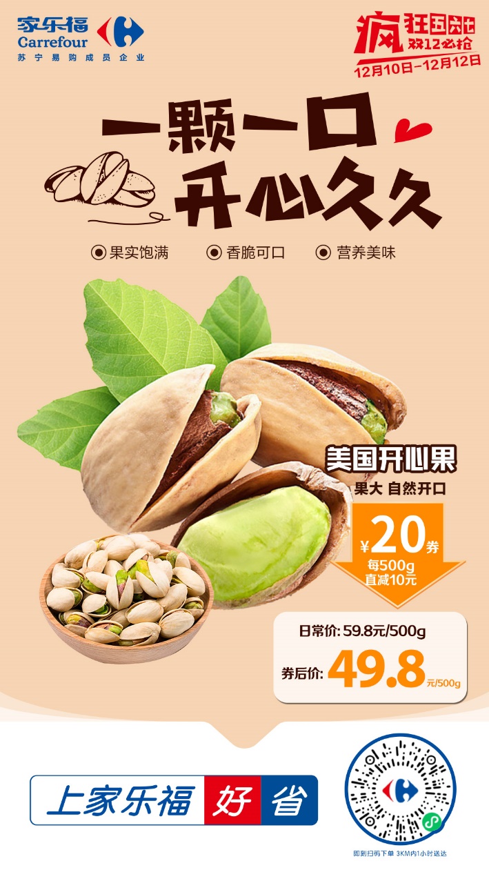 而来自美国的开心果,颗粒分明,果仁饱满,自然原色无漂白,看得见的大颗粒,美味新鲜直达。不仅有颜值,更有真材实料,自然开口,香脆可口,营养美味。制作过程严挑细选,品质保证,激发果仁原香。周末闲暇时光,泡一杯茶,就上几粒坚果,浓浓坚果香在唇齿间萦绕,满足味蕾。下单前领取20元券,每斤立减10元,享受券后疯狂惊喜价。