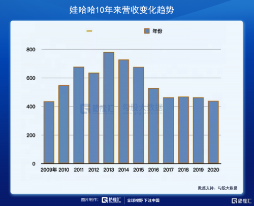 公开数据显示:2013–2016年,娃哈哈的营业收入分别为782.8亿元、720亿元、494亿元、529亿元。至2017年,营收缩减至456亿元——5年缩水超300亿元。2019年,娃哈哈以464亿元的营收再创新低——较2013年巅峰时期下滑超过40%,跌回十年前水平。