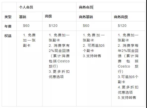 表格为Costco的四种会员选择