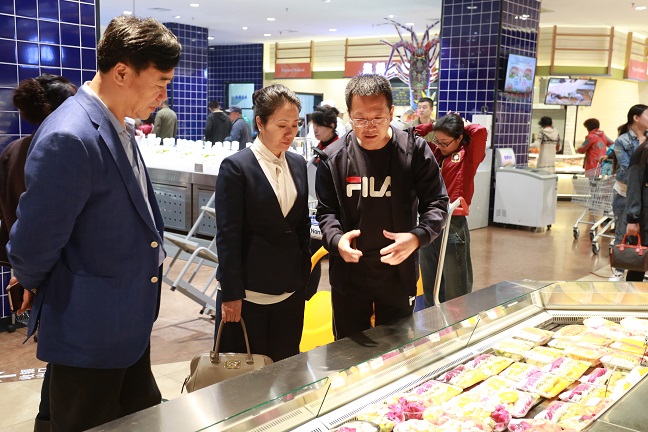 孟繁中(右一),在比优特超市检查工作