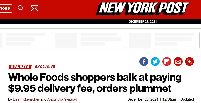 龙商网消息:12月27日消息,据纽约邮报报道,亚马逊旗下全食超市(Whole Foods)因新增亚马逊Prime会员配送费,而导致订单骤降。