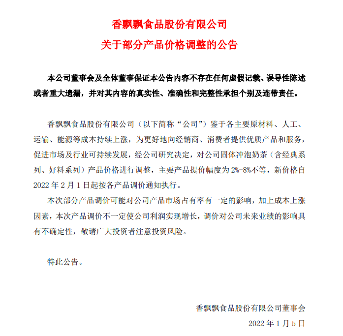 龙商网消息:香飘飘发布公告称,鉴于各主要原材料、人工、运输、能源等成本持续上涨,经公司研究决定,对公司固体冲泡奶茶(含经典系列、好料系列)产品价格进行调整,主要产品提价幅度为2%-8%不等,新价格自2022年2月1日起按各产品调价通知执行。