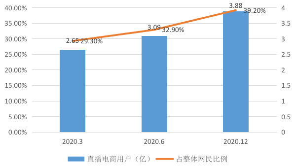同时,截至2020年3月,我国电商直播用户规模为2.65亿人,增长迅速。截至2021年12月,我国直播电商用户规模达3.88亿人,占网民整体的39.2%。