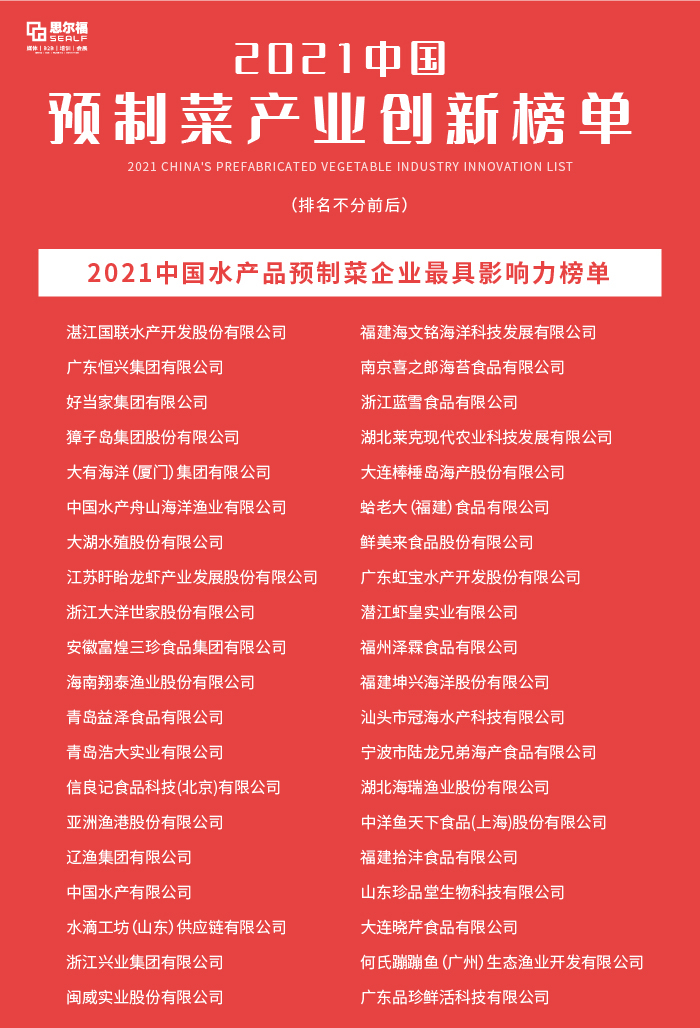 以下为大会暨展会组委会联合思尔福预制菜发布的“2021中国预制菜产业创新榜单”。