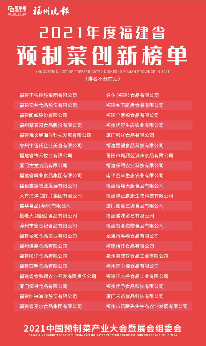 以下为大会暨展会组委会、思尔福预制菜和福州晚报联合发布的“2021年度福建省预制菜创新榜单”。