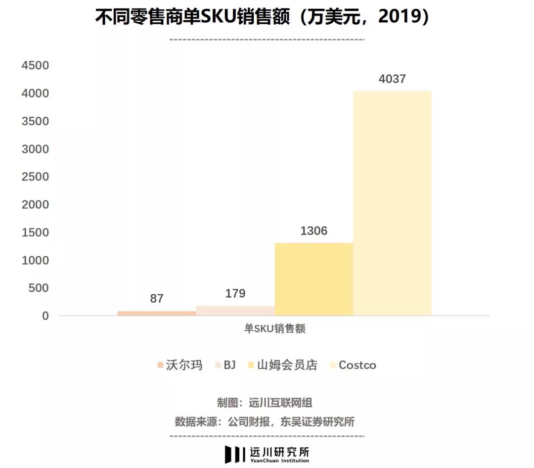 Costco的SKU在3700左右,只有沃尔玛(2万)的五分之一。品类虽少,单品规模却高一筹。2019年,Costco单个SKU的销售额超过4000万美元,远高于沃尔玛的87万美元。