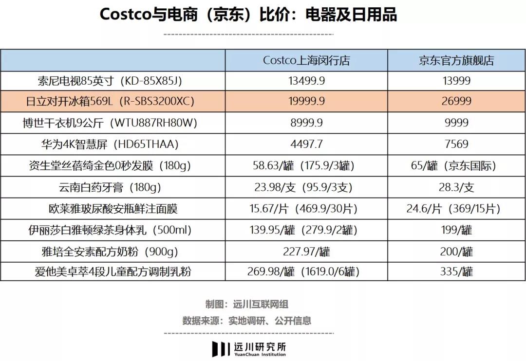 据东吴证券测算,尽管有店租和工资,但Costco的流通效率甚至比京东这种电商平台还高[5]。从下面比价图可知,在Costco有限的电器类SKU中,大多比电商渠道还要便宜,像日立的双开门大冰箱,比京东便宜了将近7000块;而在日用品领域,Costco大包装平摊下来的单位价格也大多比京东便宜。