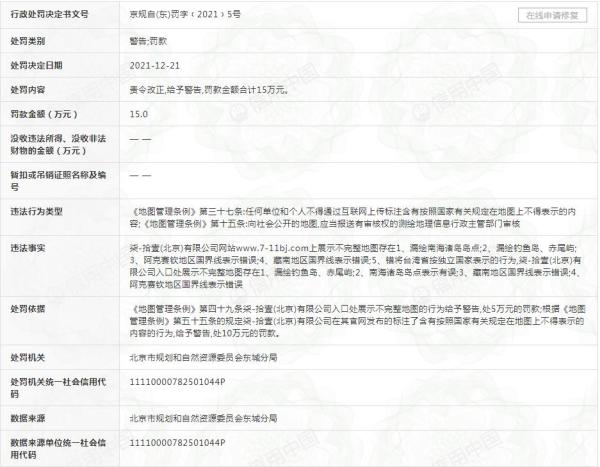 龙商网消息: 近日,柒一拾壹(北京)有限公司新增一则行政处罚,处罚事由为柒-拾壹(北京)有限公司网站www.7-11bj.com上展示不完整地图存在漏绘南海诸岛岛点;漏绘钓鱼岛、赤尾屿;阿克赛钦地区国界线表示错误;藏南地区国界线表示错误;错将台湾省按独立...