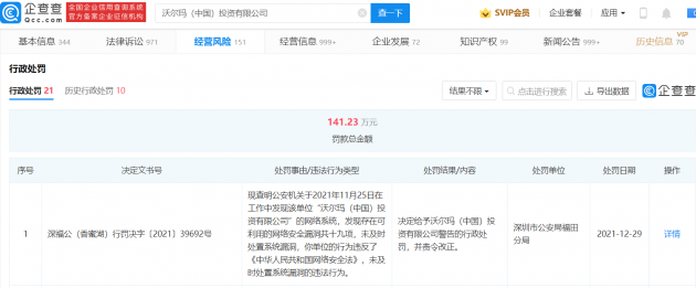 企查查APP显示,近日,沃尔玛(中国)投资有限公司新增行政处罚信息。 处罚事由为发现该单位的网络系统存在可利用的网络安全漏洞共十九项,未及时处置系统漏洞,违反了《中华人民共和国网络安全法》第二十五条、第五十九条第一款之规定,处罚结果为决定给予...