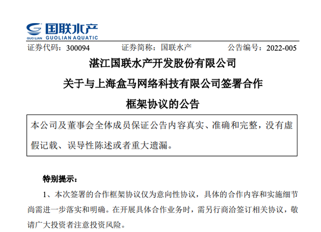 龙商网消息: 1月11日消息,国联水产发布公告称,公司于2022年1月11日与上海盒马网络科技有限公司签订了《合作框架协议》,双方基于良好的信任,处于双方长远发展上的考虑,决定共同携手,在水产预制菜品开发与市场推广、共建乡村振兴产业园区、联合品牌合作...