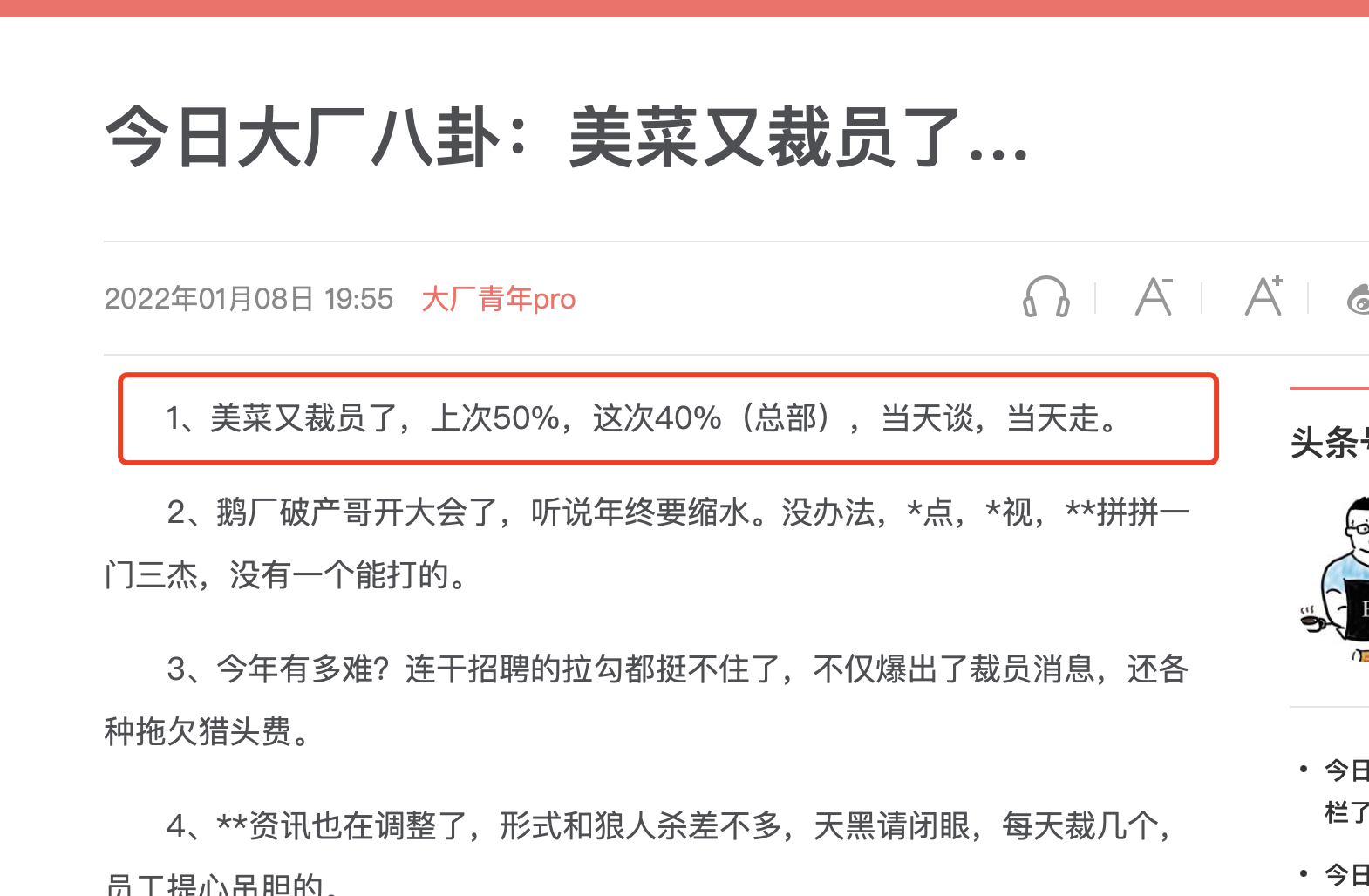 近日,有疑似美菜网离职员工在社交爆料,继上次50%比例裁员后,美菜北京总部又裁了40%的人员。此外,原本在北京市王府井银泰商场的美菜网总部,现已搬到北京站附近。 另一位已离职的美菜网员工向凤凰网科技表示,美菜网一直在裁员,前段时间裁了一些业务总监...