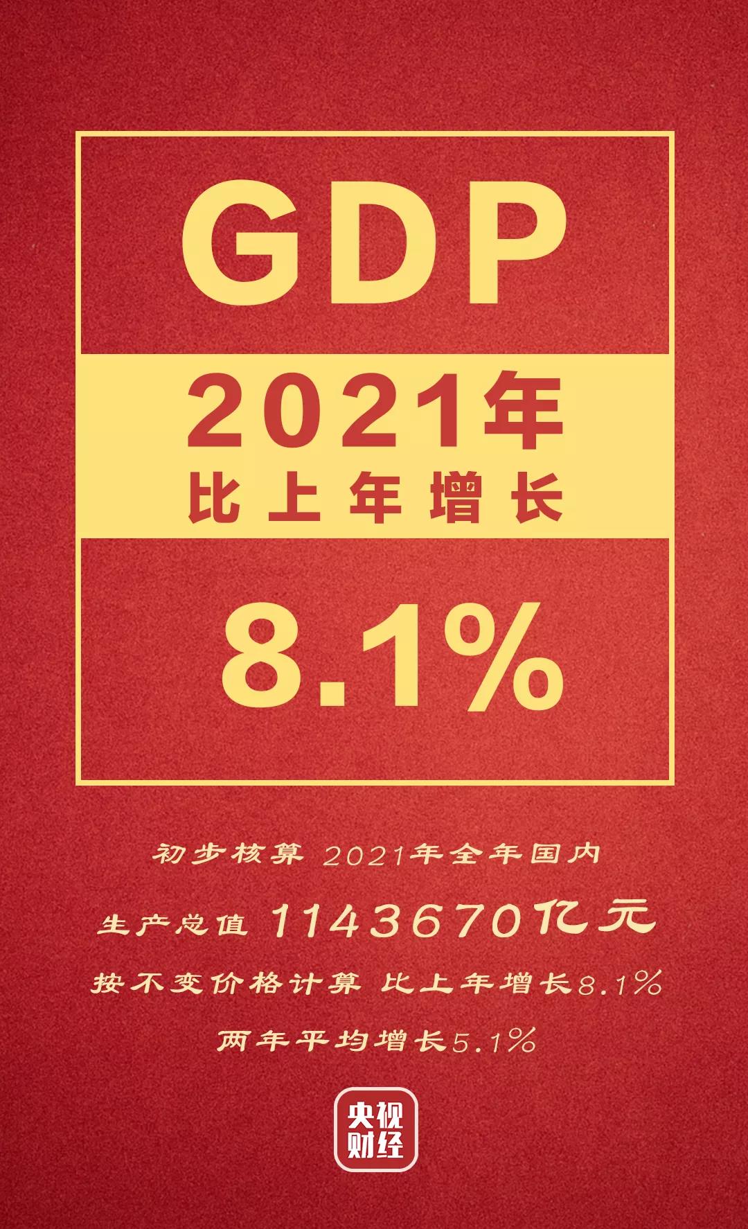 龙商网消息:国家统计局17日公布,初步核算,2021年全年国内生产总值(GDP)超114万亿元,为1143670亿元,按不变价格计算,比上年增长8.1%,两年平均增长5.1%。实现了“十四五”良好开局。