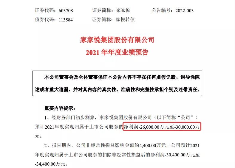 家家悦发布2021年年度业绩预告,预计2021年度实现归属于上市公司股东的净利润-26,000万元至-30,000万元。