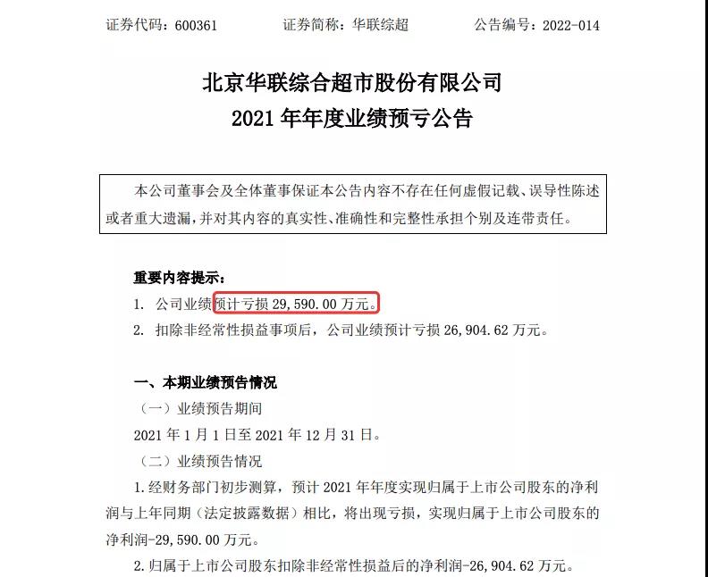 1月28日,北京华联综超市发布2021年年度业绩预告,预计2021年实现归属于上市公司股东的净利润-29590.00万元;归属于上市公司股东扣除非经常性损益后的净利润-26904.62万元。该公司上年同期,归属于上市公司股东的净利润为10311.70万元,归属于上市公司股东的扣除非经常性损益的净利润9101.15万元。