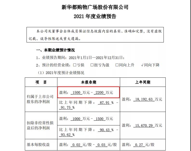 1月29日,新华都发布2021年度业绩预告,预计业绩同向下降。报告期内归属于上市公司股东的净利润1500万元-2200万元,比上年同期下降87.91%-91.75%。