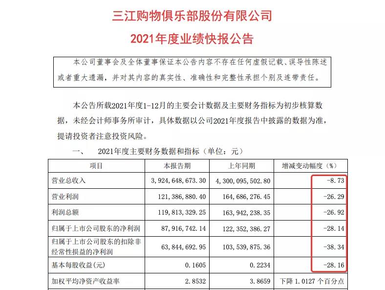 1月24日,三江购物发布2021年度业绩快报公告,2021年度,公司实现营业收入39.25亿元,同比下降8.73%,其中,主营业务收入37.44亿元,同比下降9.22%;归属于上市公司股东净利润8791.67万元,同比下降28.14%;归属于上市公司股东的扣除非经常性损益的净利润6384.47万元,同比下降38.34%。