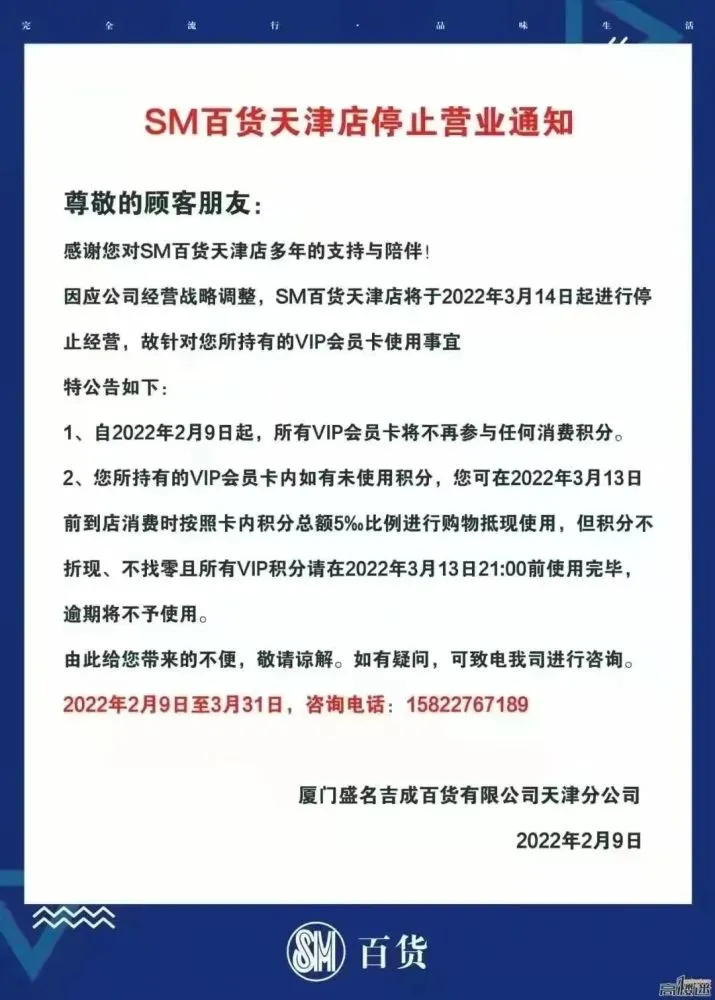 龙商网消息: 日前,厦门盛名吉成百货有限公司天津分公司发布了《SM百货天津店停止营业通知》,称因公司经营战略调整,SM百货天津店将于3月14日起停止经营。