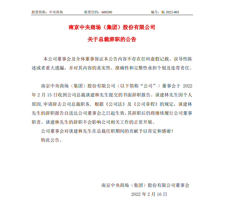 据悉,南京中央商场(集团)股份有限公司董事会于2月15日收到公司总裁谈建林先生提交的书面辞职报告。谈建林先生因个人原因,申请辞去公司总裁职务。