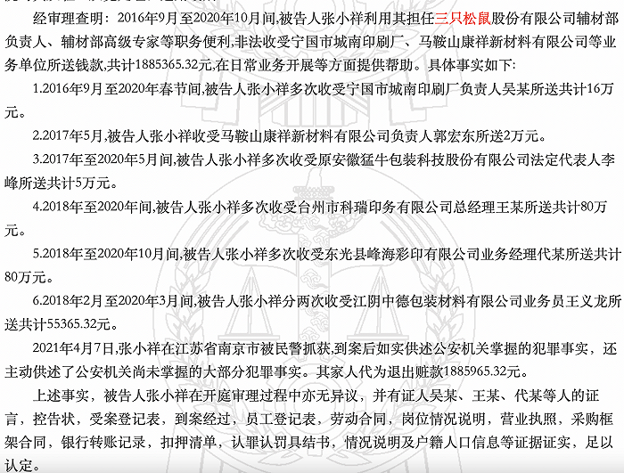 根据裁判文书网去年12月11日和12月27日的两份判决书,三只松鼠被告人产品中心经理张某祥,利用职务便利,在2016年9月至2020年10月间,非法收受宁国市城南印刷厂、马鞍山康祥新材料有限公司等业务单位所送钱款共188.54万元,并在日常业务开展等方面提供帮助。