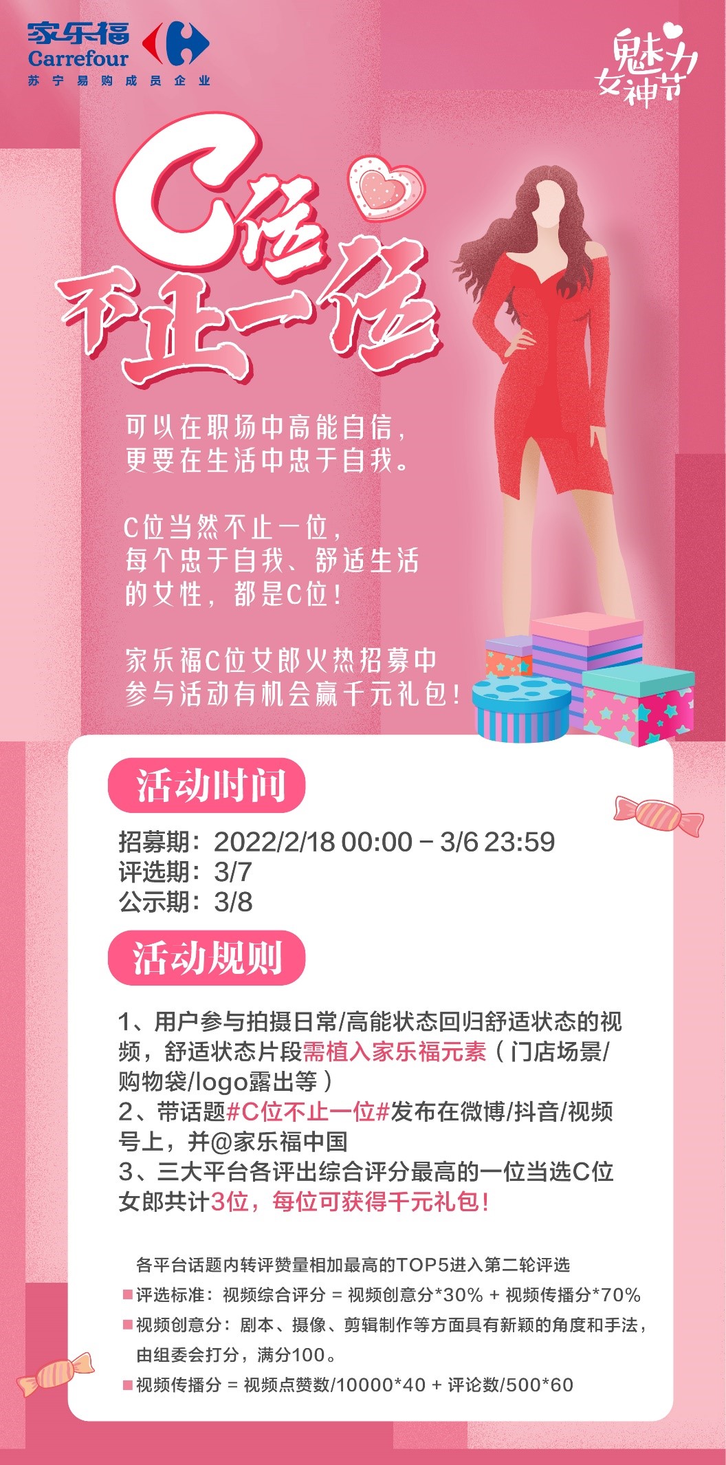 即日起至3月6日,参与“C位女郎”招募活动,需拍摄日常或高能状态回归舒适状态的视频,并在舒适状态片段中植入如家乐福门店场景、购物袋、LOGO等家乐福元素,在抖音、微博、视频号上带#C位不止一位#的话题发布,并@家乐福中国,即可参与赢取千元礼包。最终,家乐福将在抖音、微博、视频号三大平台各评选出一位综合评分最高的“C位女郎”,共计3位,公示并发放千元礼包。(详见活动海报,活动解释权最终归家乐福中国所有)