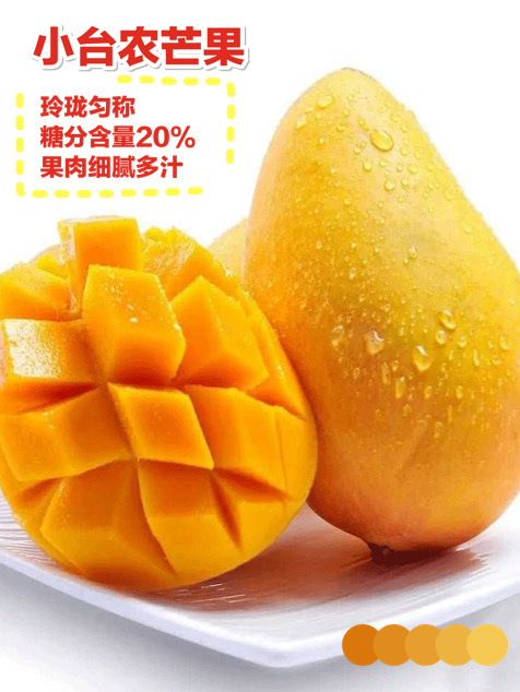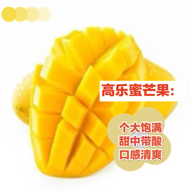 高乐蜜芒果个大饱满,果皮细致紧密光滑,切开之后香气浓郁,甜中带酸,口感清爽香滑;而小台农芒果更加小巧玲珑,果皮果点、花纹明显,果肉细腻纤维少,肉厚多汁,果肉食用率高达95%,入口即化。无论是直接食用,还是用来做甜品,都深受消费者喜爱。