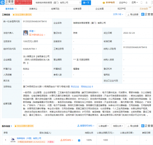 龙商网消息: 企查查APP显示,2月24日,瑞幸咖啡商务管理(厦门)有限公司成立,法定代表人为郭谨一,注册资本1000万元人民币,经营范围包含:互联网销售;食品销售;餐饮服务;化妆品零售;个人卫生用品销售等。企查查股权穿透显示,该公司由瑞幸咖啡(中国...