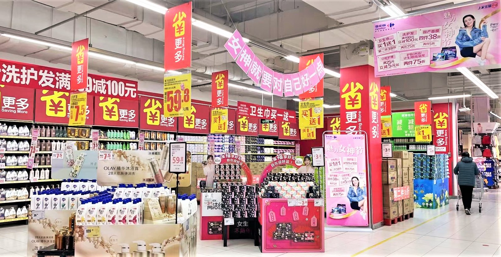 “开年了,三八节就是囤卫生巾、洗发水的好时候”,在上海的一家家乐福门店,小李和同事推着满满一购物车卫生巾,对着清单精挑细选,“卫生巾的保质期一般为3年,家乐福现在活动多、力度大、质量有保障。小程序下单也不用拎,当然要买。”