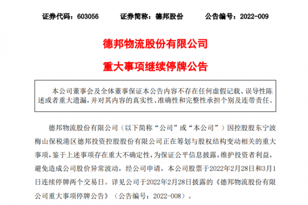 3月2日,德邦股份(603056)发布公告称,停牌期间,交易各方就控股股东股权结构变动相关事项进行了进一步沟通协商,尚未签署相关交易协议,公司预计无法在3月2日开市起复牌,股票继续停牌,预计停牌时间不超过3个交易日。