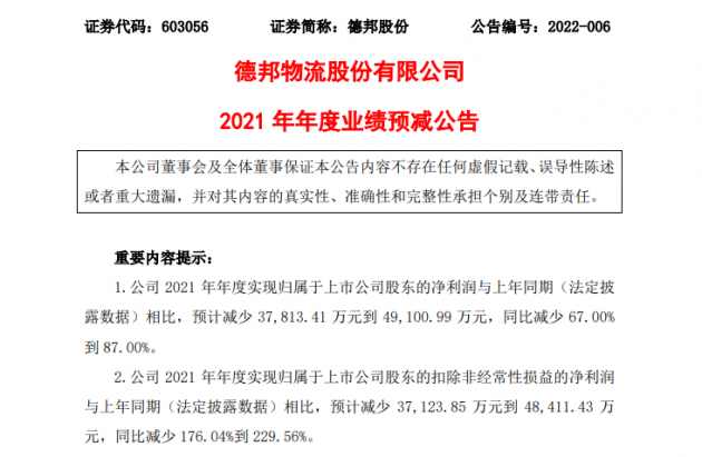 德邦股份1月28日晚间发布业绩预告,预计2021年年度实现归属于上市公司股东的净利润与上年同期相比,预计减少约3.78亿元到约4.91亿元,同比减少67%到87%。