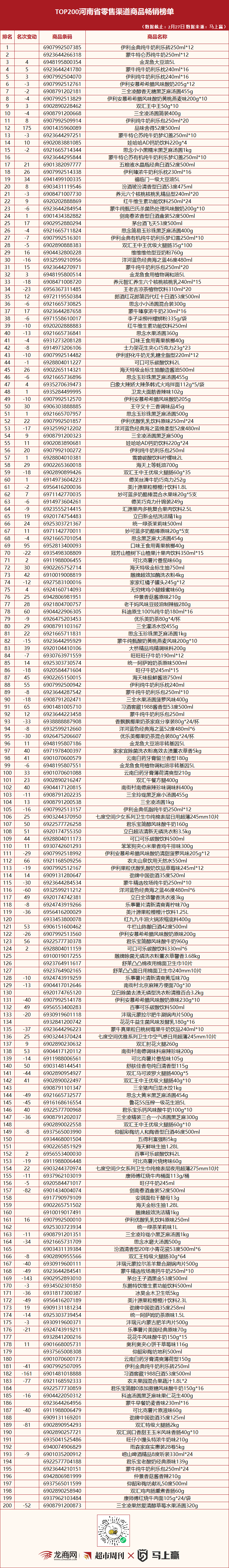 “TOP200河南省零售渠道商品畅销榜单”发布(1月23日版)