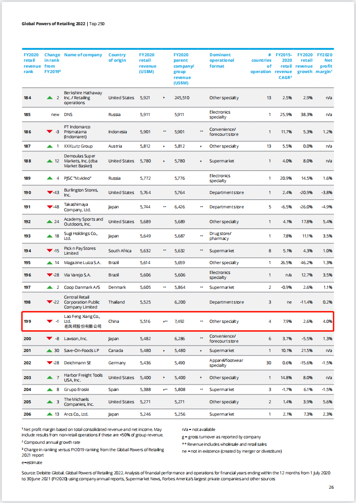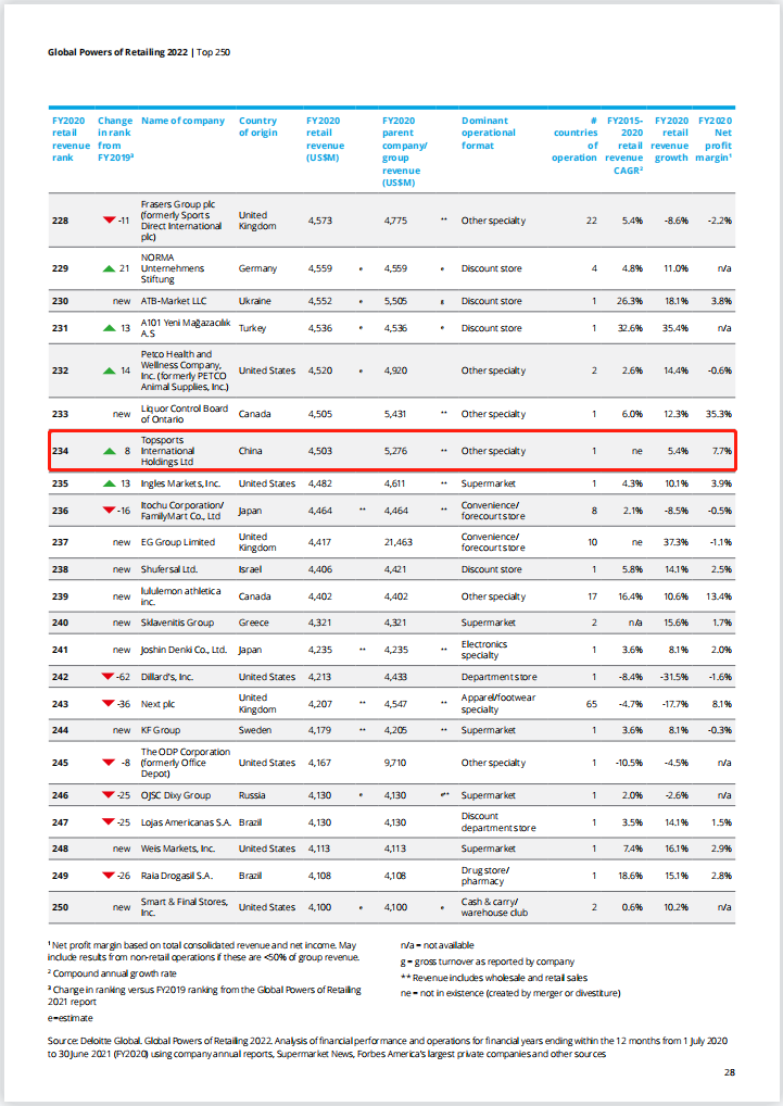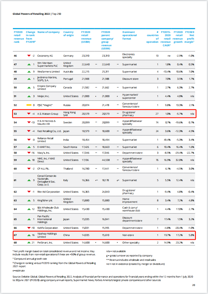 近日,德勤发布《2022全球零售力量》报告。该报告基于2020财年(2020年7月1日至2021年6月30日)的公开数据进行排名,统计出全球250强零售榜单。
